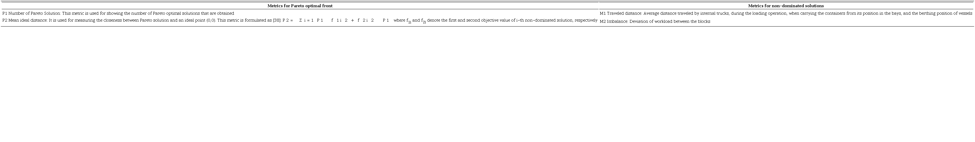 Performance Metrics. Storage space is a critical resource in container terminals. Thus, the main objectives of space allocation decisions for outbound containers are to utilize space efficiently and make loading operations more efficient. When a problem is formulated as a bi-objective optimization problem, the solution's performance assessment is less straightforward than when formulated as a single-objective optimization problem. It is mainly because, in bi-objective optimization (where there is conflicting nature of the objectives), two goals are searched during iterations of the algorithms: