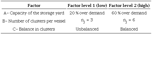 This section describes the experimental framework used to analyze the impact of the main factors involved in the storage space allocation problem, for which there is an empirical conjecture affecting the performance metrics defined above. As issued here, a sensitivity analysis on the performance metrics, when varying the factors under consideration, is performed. Three experimental factors have been considered (see Table 2). Factor A refers to the capacity of the container terminal; it is used to see how storage space decisions are affected when the storage capacity is close to critical congestion. Factors B and C are related to the clustering results; we aim to analyze how storage space decisions are affected by the solution of the first phase of our proposed approach.