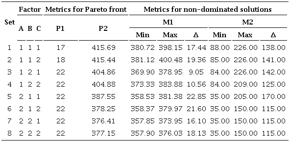 Each one of the 23 factor level combinations represents a sample scenario. For each scenario, ten sample instances were created and solved to find their Pareto frontier. Considering that for each frontier, 22 points are computed in order to compute the metrics, (8)(10)(22) = 1760 linear programming models were solved. All experimental results have been generated and analyzed using a laptop Intel Core i7 2.4 GHz with 16 GB of RAM. We used CPLEX to solve the optimization models and MINITAB to carry out the statistical analysis.