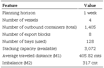The ATP terminal moves on average 1,400 outbound containers per week. The arrival of outbound containers begins from 3 to 4 days before the arrival of the vessel. Thus, the planning horizon for storage space decisions is four days. The current stacking policy of the ATP corresponds to a semi-random assignment, in which export (outbound) containers are stacked in one of the predefined block-bays, according to their departure vessel. Export containers are sent to the less congested block where storage space has been assigned for the corresponding vessel. This strategy causes many reallocations when containers are retrieved to be loaded onto their corresponding vessels. The proposed approach is motivated by the need to improve this situation.