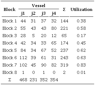 We choose an ordinary week from these historical records, in order to take a real instance and analyze the behavior of the ATP when managing outbound containers (see details in Table 4). In this instance, 1,405 outbound containers arrive during the planning horizon. The current decision method of the terminal results in an average travel distance of 405.82 meters per container during the loading operations, and an imbalance of 317 containers among the blocks. Table 5 shows the detailed distribution of containers among the blocks.
