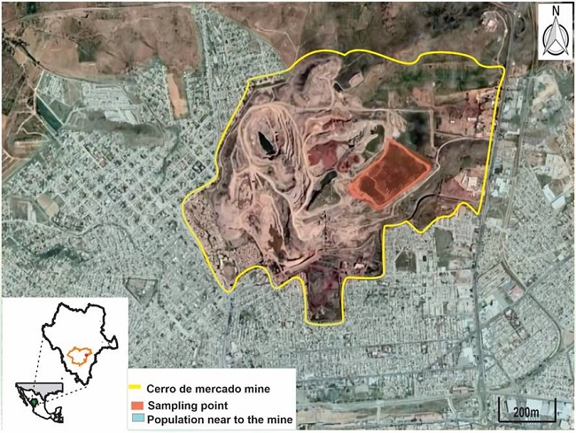 The iron deposit “Cerro de Mercado” is located at the center of the state of Durango, in northern Mexico, being exploited from colonial times to the present days. It is currently processing around 1200 tons per day, using flotation methods and magnetic concentration (SGM, 2018). The Durango 2020 urban development program, points out that the “Cerro de Mercado” mine pollutes with the emission of a reddish dust that comes from the exploitation of iron ore, which, due to the wind, falls over housing located in the neighboring settlements, causing severe health problems.