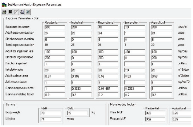 The metal concentrations (antimony, arsenic, barium, chromium (III), strontium, manganese, nickel, vanadium and zinc using the X-Ray fluorescence technique), were introduced in the software. Due to some pollutant limitations of the software, metals such as Fe, Ca, Ti and Rb were not loaded. The exposure parameters for each case used by the software are shown in Figure 2. The body weight parameters, for adults and children were modified as well as the lifetime by the values reported by INEGI (2016) for the population of Durango.