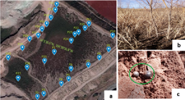 The tailings intake was carried out at the Boleo Estrella dam, which stopped operating 15 years ago. It has an area of 16200 m2, a depth of 80 m, and 3,700,000 tons of tailings. Samples were taken in a rectangular pattern, at a depth of 30 cm, obtaining 27 samples (Figure 4a). During sampling, extensive vegetation was observed as well as various insects (Figures 4b, 4c). The quantity of tailings taken at each point was approximately 4 kg, which were placed in airtight polyethylene bags for further analysis.
