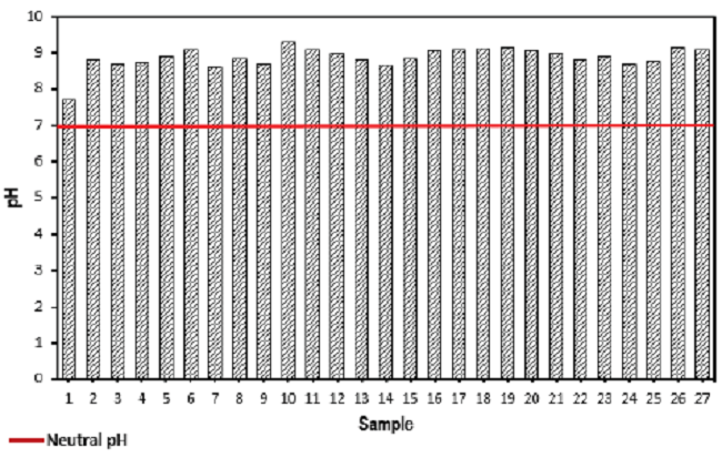 All 27 samples had a higher pH value of 7 (Figure 5) indicating that metals present in tailings have low solubility and are unlikely to reach aquifers (Yang et al., 2015).