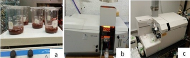Since the presence of two metals in the tailings exceeded the LMP in dry-base, leaching tests were performed (Figure 6) as required by the Mexican regulations, obtaining that in the composite sample analyzed an antimony concentration of 2.1 mg/ml was found. This value exceeds the 0.5 mg/ml established in Mexican regulations.