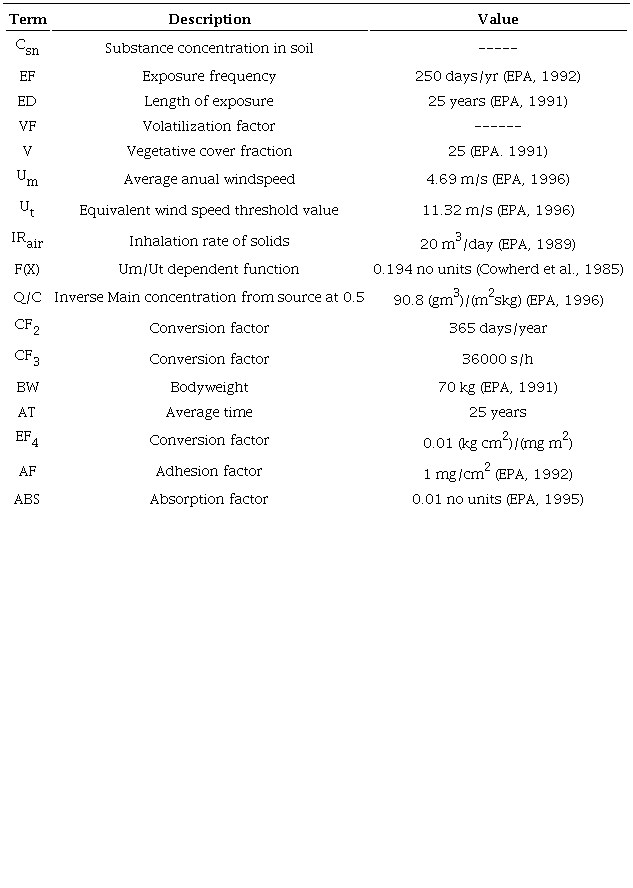 Based on the information provided by the workers of “Cerro de Mercado” mine, the houses around the mine are built on tailings dam, people living in these houses are in direct contact with tailings, therefore for the above, this was selected as the soil matrix for further calculations. When calculations were made, the following routes were selected: Inhalation and dermal. The reason for this is that during the exploration of the population near the study site, it was found that since wind that disperses the tailings, individuals are in contact with them without even noticing it. For the selected pathways, the equations to perform the risk calculations executed by the software are as follows: