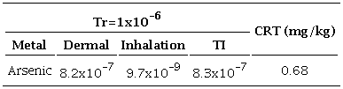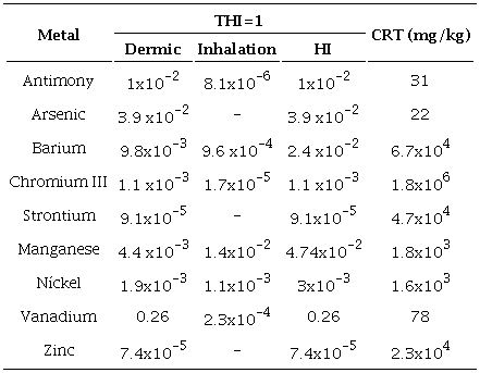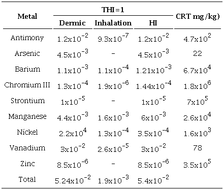 The calculations result for non-carcinogenic health effects in adults due to the presence of heavy metals tailings, are presented in Table 4.