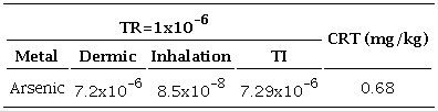 When comparing the results of the HI columns as well as the total reference concentrations (CRT) (Semarnat, 2009), (EPA, 2016) it is observed that the HI values do not exceed the CRT values so, according to EPA, (1989) and Fowle & Dearfield (2000) adverse effects on the health of the population are not likely to be observed due to contact and inhalation of tailings from the “Cerro de Mercado” mine. On the other hand, arsenic is recorded by SADA as a substance with the ability to generate carcinogenic and non-carcinogenic effects on health, the calculations for carcinogenic effects are shown in Table 5.