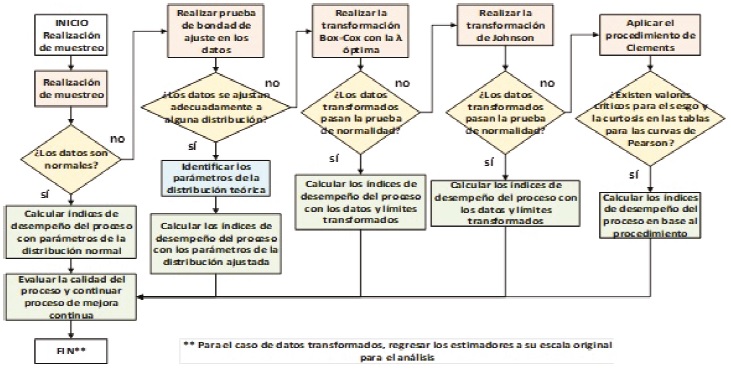 En caso de no obtener un buen resultado en los métodos anteriores, pasar al procedimiento de Clements que se define más adelante y realizar el cálculo de los índices de desempeño en el proceso. El procedimiento propuesto es robusto y genera alternativas para el analista en presencia de datos no-normales.