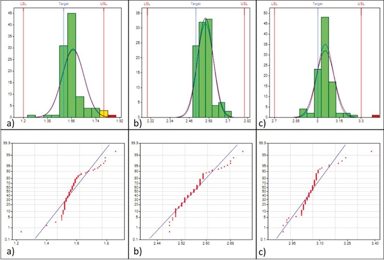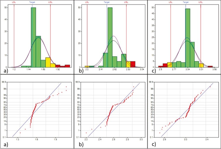 Para estudiar la capacidad del proceso se realizaron 100 observaciones mediante un muestreo en cada uno de los tres grosores, con base en la recomendación del tamaño muestral mínimo para estudios de desempeño del proceso en el manual SPC de la AIAG (2015), las lecturas se obtuvieron antes y después de la implementación del rodillo en la máquina. Inicialmente debe verificarse si se cumple la normalidad mediante una prueba de hipótesis para verificación de normalidad mediante pruebas de bondad de ajuste (Anderson-Darling, Kolgomorov Smirnov, Ji-Cuadrada, etc.) y el uso del gráfico de probabilidad normal. En caso de no existir ajuste adecuado pasar a las pruebas de bondad de ajuste con distribuciones teóricas conocidas, en caso de existir alguna trabajar con los parámetros de la distribución.