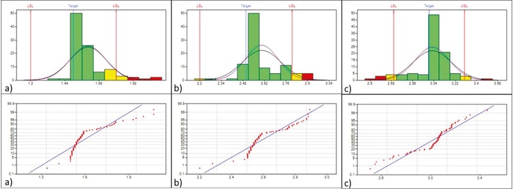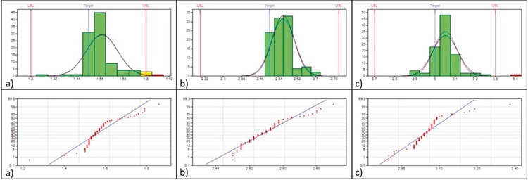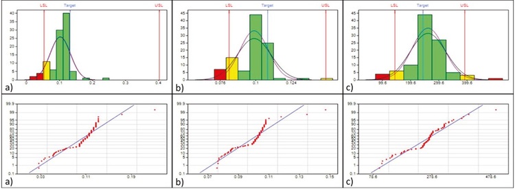 El método de Clements arrojó resultados para las mediciones de antes y después de la implementación del rodillo en los 3 grosores, se considera que estos son los estimadores más confiables del estudio, ya que los datos se adaptaron de forma correcta a los valores de sesgo y curtosis disponibles en las distribuciones de Pearson. Los gráficos de capacidad y de probabilidad normal se muestran en las Figuras 10 y 11.