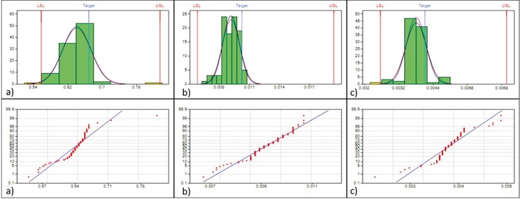 El método de curvas de Johnson permitió transformaciones de valor P < 0.05 y que no pasan la prueba de hipótesis para normalidad, como se observa en los gráficos de capacidad y de probabilidad normal en las Figuras 8 y 9. Los resultados obtenidos para los índices de desempeño del proceso son cercanos a los obtenidos por la transformación Box-Cox. En la Tabla 3 se muestran los estadísticos e índices de desempeño por el método de Clements.