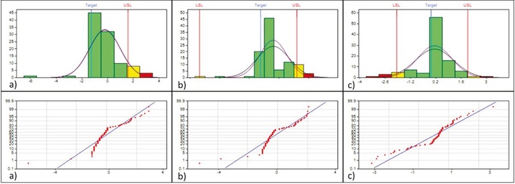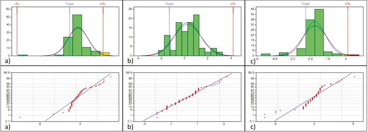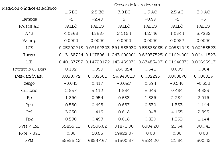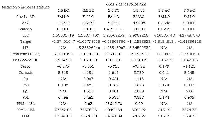 La primera observación en el método de Box-Cox es que los datos transformados no se ajustaron a la distribución normal en ninguno de los grosores de rollo (Figura 6 y 7), por lo que los índices estimados no son confiables. Se observa que los índices de desempeño mejoran después de la implementación del rodillo debido a que se reduce la variación en el proceso. La Tabla 2 muestra las medidas estadísticas e índices de desempeño por el método de Johnson.