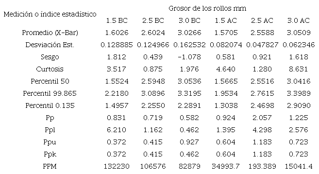 El método de Clements permitió un buen ajuste a curvas de la familia de Pearson mediante el criterio del sesgo y curtosis, por lo que los índices obtenidos son los adecuados para el estudio del proceso. Se observa una mejora significativa en el desempeño del proceso en los muestreos después de implementar el rodillo en la máquina, esto se logró con la reducción de la variación del grosor de los rollos a lo largo del área, demostrándose la mejora en el proceso por medio de la implementación del dispositivo.