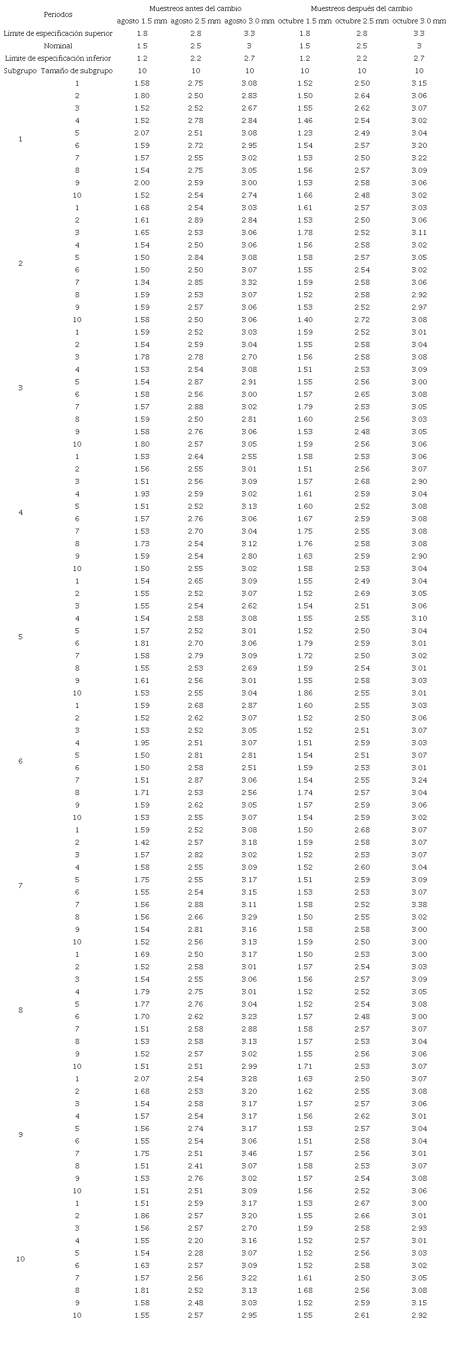 Se realizó un muestreo del proceso de división antes y después de la implementación del rodillo, el muestreo se realizó por subgrupos de tamaño 10 al inicio de la división de 10 rollos para cada uno de los siguientes calibres 1.5 mm con límites (1.2, 1.8 mm), 2.5 mm con límites (2.2, 2.8 mm) y 3.0 mm con límites (2.7, 3. 0 mm), que son los rollos más solicitados por los clientes, el proceso se realizó en el transcurso de un mes. El muestreo se realizó de esta forma con base en los principios del control estadístico de procesos, realizando las muestras en espacios de tiempo considerables que permitan detectar causas especiales de variación.