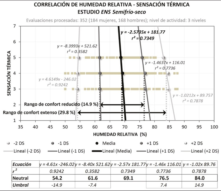 En este caso, los modelos matemáticos que permiten estimar el confort hígrico resultaron de la siguiente manera: y-2.5785x+181.77 para la HRn; y-8.3993+521.62 y y=-1.4637x+116.01 para los límites inferior y superior del rango reducido de confort, respectivamente; y, y=4.6149x-246.02 y y=-1.0212x+89.757 para los límites inferior y superior del rango extenso de confort, respectivamente.