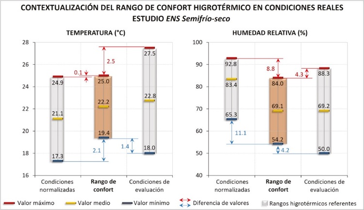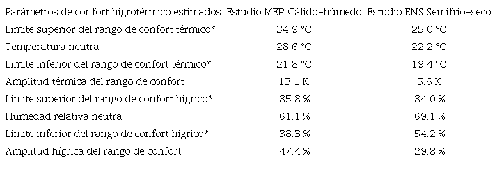 La diferencia identificada entre los valores térmicos del límite superior equivale a prácticamente 10 °C, mientras que la obtenida con los valores del límite inferior corresponde a 2.5 °C en términos prácticos. No obstante, la diferencia con mayor contundencia se presenta en la amplitud que guarda cada rango de confort térmico, la cual equivale a 13.1 K para el estudio MER Cálido-seco y 5.6 K para el estudio ENS Semifrío-seco; naturalmente, el confort térmico estimado con este último tiende a bajas temperaturas.