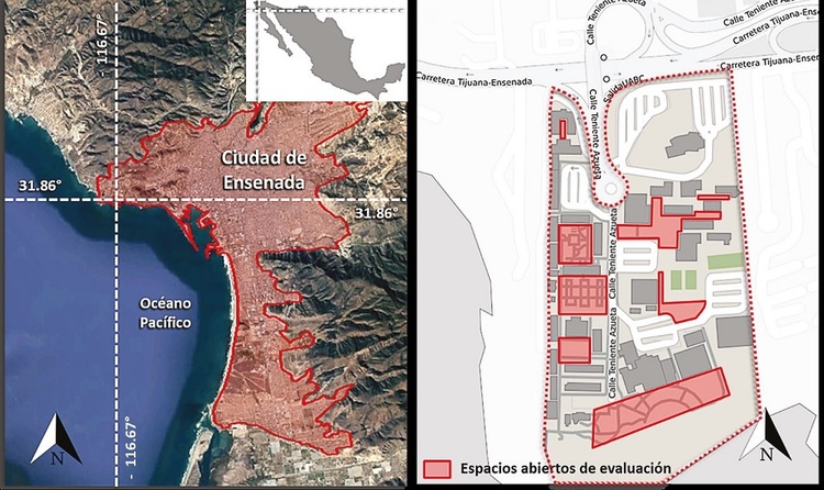 En este caso, la población blanco correspondió con la poblacional total de Ensenada que contará con un periodo mayor a un año viviendo en la ciudad, en caso de no ser originarios de ella. El estudio se desarrolló en los espacios exteriores de la Universidad Autónoma de Baja California (UABC): Plazas, malecón, áreas verdes (recreación, estudio y descanso) y circulaciones, entre otros (Figura 2). En adelante, a este estudio se le denominará ENS Semifrío-seco.