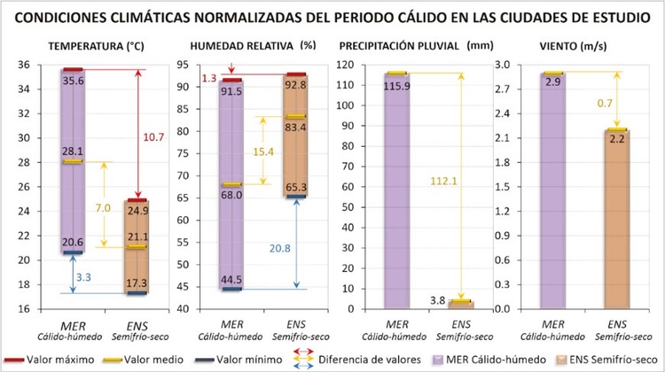 Con el objetivo de atender el periodo de mayor incidencia en la percepción higrotérmica de las personas, el estudio se llevó a cabo durante el periodo cálido de cada ciudad. De esta manera, en el estudio MER Cálido-húmedo se desarrolló durante abril y mayo, con temperaturas máxima, media y mínima de 35.6 °C, 28.1 °C y 20.6 °C; humedades máxima, media y mínima de 91.5 %, 68.0 % y 44.5 %; precipitación total de 115.9 mm; y, viento de 2.9 m/s del sureste (SMN-CONAGUA, 2019a) (Figura 3). Por su parte, en el estudio ENS Semifrío-seco se desarrolló durante agosto y septiembre, donde las temperaturas máxima, media y mínima son de 24.9 °C, 21.1 °C y 17.3 °C; las humedades máxima, media y mínima son de 92.8 %, 83.4 % y 65.3 %; la precipitación total de 3.8 mm; y, el viento de 2.2 m/s del suroeste (SMN-CONAGUA, 2019b) (Figura 3).