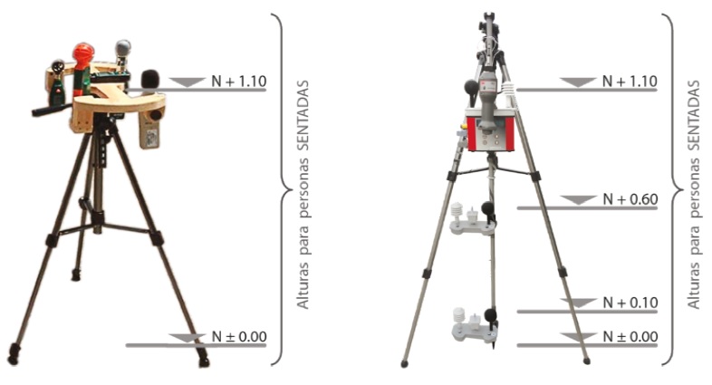 Por su parte, en el estudio ENS Semifrío-seco la TBS, la TGN, la HR y la VV fueron medidas con un monitor de ambiente térmico de tres arreglos (marca 3M, modelo QUESTemp 36-3) (Figura 4). Este equipo de monitoreo ambiental cuenta con una resolución de 0.1 °C para la TGN y la TBS, 0.1 % para la HR y 0.1 m/s para la VV, y una precisión de ± 0.5 °C para la TBS y la TGN, ± 3.0 % para la HR y ± 0.1 m/s para la VV (3M, 2019). La selección, la distribución y la operación del equipo de medición se realizó con base en la ISO 7726 (1998) y la ANSI/ASHRAE 55 (2017), lo que permitió clasificar a la base de datos como clase I (Brager & de Dear, 1998).