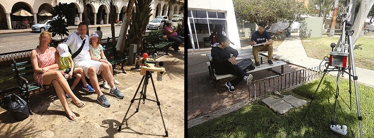 En todos los casos, los cuestionarios se aplicaron en las condiciones en las que se encontraban los sujetos evaluados previo a la entrevista: Condiciones naturales de ventilación; expuestos o no al Sol (sombra); de pie, sentados o acostados; sin modificar la actividad ni el nivel de arropamiento en los que se encontraban; y, sin alterar su entorno inmediato ni las acciones de adaptación que pudieran manifestar (ingesta de bebidas, empleo de gorra o gafas, etcétera), con el fin de atender rangos higrotérmicos universales aplicables a la población blanco en cada caso (Figura 5).