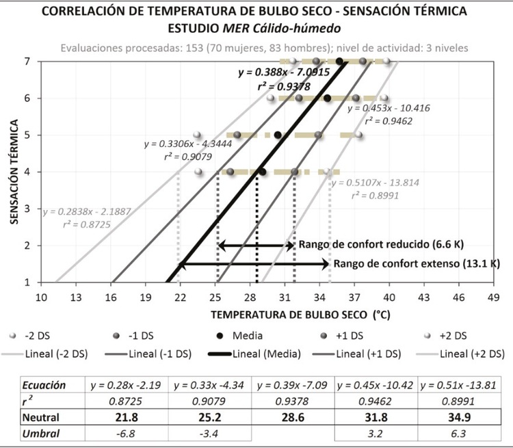De acuerdo con Bojórquez (2010), la correlación que permitió estimar cada uno de los valores mencionados es muy alta, ya que se obtuvo una r2=0.9378 para la Tn; una r2=0.9079 y una r2=0.9462 para los límites del rango reducido de confort; y, una r2=0.8725 y una r2=0.8991 para los límites del rango extenso de confort. El valor de la pendiente en cada caso se ubica entre 0.2838 y 0.5107, esta se incrementa en dirección a los límites superiores de los rangos de confort.