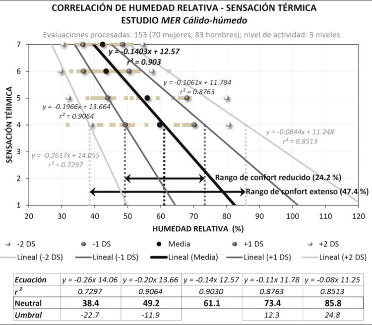 De acuerdo con Bojórquez (2010), es alta la concentración de los puntos que permitieron estimar cada uno de los valores mencionados, pues la HRn obtuvo una r2=0.9030; los límites del rango reducido de confort, una r2=0.9064 y una r2=0.8763; y, los límites del rango extenso de confort, una r2=0.7297 y una r2=0.8513. El porcentaje de la pendiente en cada caso se ubica entre 8 % y 26 %, esta se incrementa en dirección a los límites inferiores de los rangos de confort.