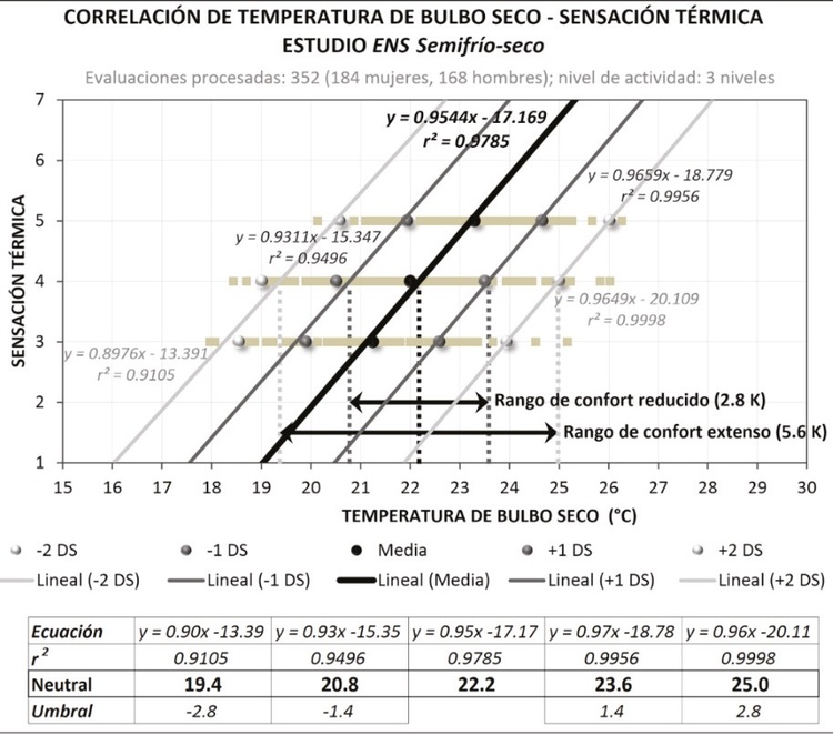 Los modelos matemáticos obtenidos para estimar el confort térmico, son: y=0.388x-7.0915 para la Tn; y=0.3306x-4.3444 y y=0.5107x-13.814 para los límites inferior y superior del rango reducido de confort, respectivamente; y, y=0.2838x-2.1887 y y=0.5107x-13.814 para los límites inferior y superior del rango extenso de confort, respectivamente. En este caso, cada modelo matemático (ecuación lineal) describe numéricamente el comportamiento de la regresión lineal desde la cual se estima tanto el valor neutral (confort) como los límites superior e inferior de cada rango de confort, por lo que al despejar a X como variable independiente y sustituir a Y con un valor constante de 4 (categoría de ni calor, ni frío en la escala subjetiva de ST) es posible obtener el valor térmico que correspondería a la Tn y sus rangos de confort, respectivamente. Por su parte, el valor del coeficiente de determinación (r2) da razón del grado de asociación que cada observación recabada representa en relación con la línea de tendencia obtenida con el total de datos que conforman la nube de dispersión en cada caso.