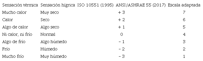En ambos estudios el cuestionario se diseñó atendiendo el instrumento utilizado por algunos referentes especializados en el tema (González, 2012; Budawi, 2007; Gómez et al., 2007a, Stoops, 2001) y lo que la normativa nacional (STPS, 2001) e internacional sugieren al respecto (ISO 10551, 1995; ANSI/ASHRAE 55, 2017; ISO 8996, 2004). Las preguntas relacionadas con la sensación higrotérmica del ambiente se basaron en la escala subjetiva de siete puntos contenida en la ISO 10551 (1995) y la ANSI/ASHRAE 55 (2017), y fue adaptada como se indica en la Tabla 1.