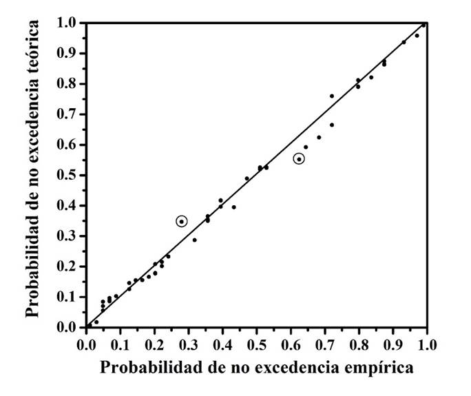 En la Tabla 6 se muestra una parte de las probabilidades de no excedencia bivariadas, empíricas observadas y teóricas calculadas con la FC de Gumbel-Hougaard. También se indican sombreadas las diferencias máximas negativa y positiva. Yue (2000) sugirió un contraste gráfico entre ambas probabilidades, para ratificar su adopción, este se expone en la Figura 1 para los datos completos de la Tabla 6.