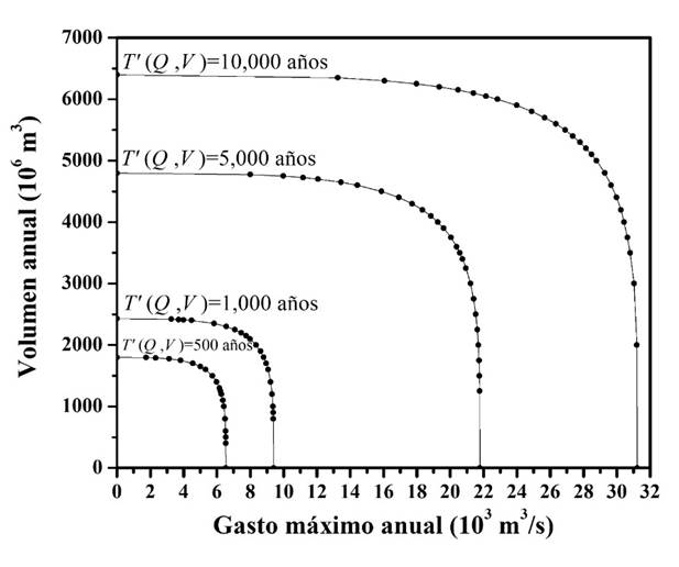 Los periodos de retorno bivariado de tipo AND se estiman con base en la ecuación 25. Se consideró conveniente realizar estimaciones para valores del de 500, 1000, 5000 y 10000 años. De manera arbitraria se seleccionan volúmenes y gastos pico, para obtener sus probabilidades de no excedencia marginales (ecuaciones 35 y 36) y conjunta (ecuación 9). En la Tabla 7 se muestran resultados para definir las cuatro gráficas de la Figura 2.