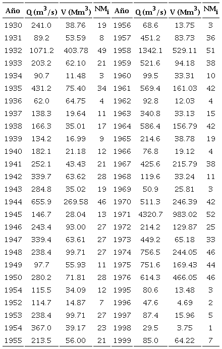 Aldama et al. (2006) muestran los 52 gastos máximos y sus volúmenes anuales de las crecientes que entran a la Presa Venustiano Carranza (Don Martín), en el estado de Coahuila, México. Su área de cuenca es de 31034 km2. Tal información se tiene en la Tabla 1.