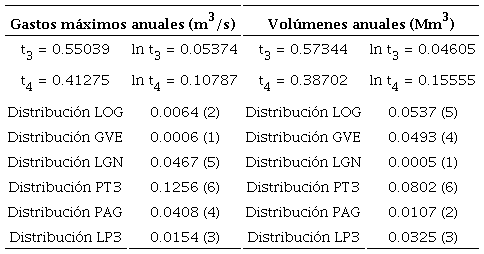 Con el criterio anterior se definieron las tres mejores distribuciones para cada registro de gasto máximo y volumen anuales. Con excepción de la distribución LP3, que se ajustó con el método de momentos en el dominio logarítmico (WRC, 1977), las otras cinco se ajustaron con el método de los momentos L (Hosking & Wallis, 1997).