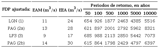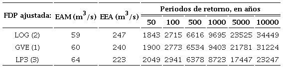 En la Tabla 3 se exponen errores de ajuste y predicciones obtenidas con las tres mejores FDP aplicadas al registro de gastos máximos de la Tabla 1. Se observa que las distribuciones GVE y LOG, conducen a los errores de ajuste más bajos del tipo EAM y relativamente reducidos del EEA. Por otra parte, la tercera mejor distribución, la LP3 condujo al EEA más bajo, pero sus predicciones se consideran reducidas. Por lo anterior, se adoptó a la distribución GVE.