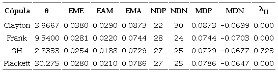Con base en los resultados de la Tabla 5, no existe dificultad para seleccionar como mejor FC la Gumbel-Hougaard, para los datos de la Tabla 1, debido a que reporta los indicadores estadísticos más reducidos (mostrados en cursivas), es la única que tiene dependencia en su cola derecha y esta se aproxima a la observada (ecuación 23) de .