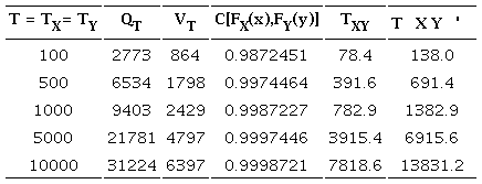 El procesamiento bivariado de los datos de la Tabla 1, condujo a los siguientes tres indicadores de asociación: rxy = 0.9188, τn = 0.6471 y ρn = 0.8274. Por otra parte, en la Tabla 5 se muestran los indicadores estadísticos de ajuste que se obtuvieron al aplicar las FC de Clayton, Frank, Gumbel-Hougaard (GH) y Plackett. En las ecuaciones 20 a 22, las probabilidades bivariadas empíricas se estimaron con la ecuación 19 y las teóricas con las expresiones 7, 4, 9 y 14.