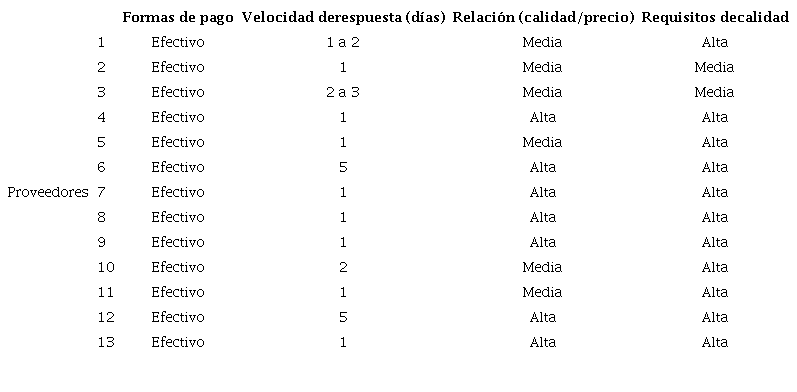 Como se puede observar, en esta tabla se evalúan cuatro criterios, donde el primero es la forma de pago y se maneja en efectivo. El criterio dos, evalúa la velocidad de respuesta en días donde este no debe ser mayor a tres. El tercer criterio relaciona la calidad y el precio, depende de la demanda en el mercado. Finalmente, en el cuarto criterio se evalúa el color, olor, temperatura y consistencia que son los requisitos de calidad.