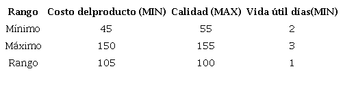La Tabla 5 se obtiene de la relación con la Tabla 4. En esta se observa en primer lugar el costo del producto que se minimizará, en segundo lugar la calidad que se maximizará y finalmente en tercer lugar, la vida útil que no debe ser mayor a dos días.