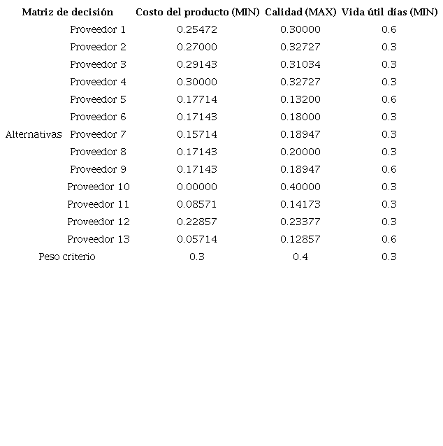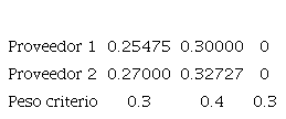 Para el proceso de la Tabla 8, los resultados se obtienen de la multiplicación del peso criterio por la matriz de decisión normalizada en cada proveedor, importante resaltar que no deben ser mayores a uno.