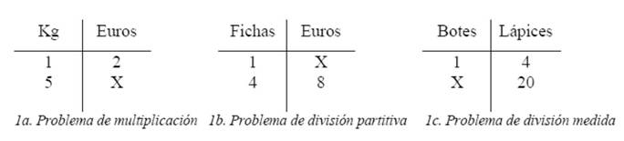 En el campo conceptual de las estructuras multiplicativas, Vergnaud (1997) identifica tres tipos de problemas multiplicativos: I) Isomorfismo de medidas, problemas cuya estructura consiste en una proporción entre dos espacios de medidas M1 y M2; II) Un solo espacio de medidas, problemas en los que se establece una correspondencia entre dos cantidades y un operador escalar designado por la palabra veces, y III) Producto de medidas, problemas cuya estructura consiste en la composición cartesiana de dos espacios de medidas M1 y M2 en un tercero, M3. En los problemas de isomorfismo de medidas existe una relación entre cuatro cantidades. En esta categoría se pueden distinguir cuatro tipos de problemas (Vergnaud, 1997; 1983): multiplicación, división partitiva, división medida y problemas de reglas de tres (estos últimos no serán objeto de estudio en el presente trabajo). En los problemas de multiplicación (Figura 1a), por ejemplo: Si un kilogramo de plátanos vale 2€. ¿Cuánto valen 5 kilogramos?, se debe trasladar la relación entre 1 y 2 a la relación entre 5 y x para encontrar la incógnita (que es el total de objetos). En los problemas de división partitiva (Figura 1b), por ejemplo: Ferran compra 4 fichas para la feria que le cuestan 8 euros. Si todas tienen el mismo precio, ¿cuánto le ha costado cada ficha?, hay que encontrar el valor de la unidad (o número de objetos por grupo). En los problemas de división medida, por ejemplo: Julia ha puesto los 20 lápices de las bandejas dentro de unos botes. Si ha puesto 4 lápices en cada bote, ¿cuántos botes ha utilizado?, la incógnita es el número de grupos que se forman de una determinada medida (Figura 1c).