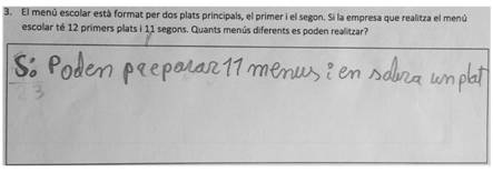 En los problemas de producto de medidas de multiplicación se combinan los elementos 1 a 1, sin tener en cuenta que pueden hacerse repeticiones, tal y como se observa en la Figura 10. El estudiante responde que si hay 12 primeros y 11 segundos, pueden prepararse 11 menús diferentes y sobra un plato.