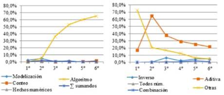Otro hecho relevante es que en los primeros cursos, los estudiantes emplean un mayor número de estrategias correctas diferentes, y la más usada es la estrategia de modelización. Sin embargo, el uso de estrategias correctas en estos dos primeros cursos es muy bajo (no supera 20%). La estrategia más usada en el 1er curso fue una estrategia incorrecta que corresponde al uso de estrategias sin sentido (incluyendo las respuestas en blanco). A partir del 2º curso la estrategia incorrecta más utilizada es la aditiva. Ambas estrategias incorrectas muestran porcentajes cada vez menores que se complementan, a medida de que los cursos avanzan, con un aumento en el uso del algoritmo.