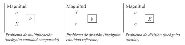 En los problemas denominados de un único espacio de medidas (Vergnaud, 1997) o de comparación multiplicativa (Nesher, 1992) aparecen dos cantidades de una única magnitud o espacio de medidas que se ven afectadas por un escalar, que normalmente viene designado por la expresión lingüística veces. Una de estas cantidades actúa como referente y la otra como comparado, y la comparación entre ambas se realiza mediante un escalar (b, Figura 2). La dirección de la comparación puede ser veces más que y veces menos que. La estructura general de este tipo de problemas, en función de cuál sea la incógnita que presentan, se muestra en la Figura 2.