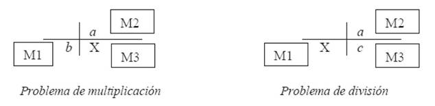 La última categoría, denominada producto de medidas por Vergnaud o producto cartesiano por Nesher (1992) y Greer (1992), está formada por la relación multiplicativa entre dos medidas elementales (M1 y M2), que da como resultado la creación de una nueva medida producto (M3). De esta manera y en función de la medida incógnita que se deba encontrar, surgen dos tipos de problemas; los problemas de multiplicación, en los que se conocen las dos medidas iniciales (a, b) y se busca la medida producto X, por ejemplo: A las clases de baile asisten 6 chicas y 4 chicos. ¿Cuántas parejas de baile diferentes se pueden realizar?, y los problemas de división, en los cuales se conoce la medida producto c y una de las dos medidas iniciales (por ejemplo a), y se busca la otra medida X, como en: La empresa del comedor escolar ofrece 20 menús diferentes formados por un primer y un segundo plato. Si la empresa cocina 5 primeros platos diferentes, ¿cuántos segundos platos cocina? (Figura 3).