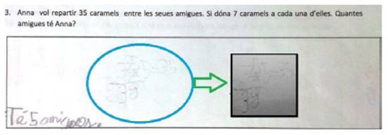 Esta estrategia implica utilizar hechos numéricos (el uso de las tablas de multiplicar). Se ha observado su uso en los problemas de isomorfismo de medidas de división medida (Figura 4), así como en los de comparación multiplicativa en los que se busca el referente o el escalar. En el ejemplo (Ana va a repartir 35 caramelos entre sus amigas. Si da 7 caramelos a cada una de ellas ¿cuántas amigas tiene?), el estudiante realizó una multiplicación (aunque posteriormente la borró) para comprobar que si reparte 7 caramelos a 5 amigas, ha repartido los 35 caramelos que disponía. Nosotros conjeturamos que el niño se apoya en el conocimiento (o construcción) del hecho numérico 7x5=35 para encajar este hecho en su comprensión de la situación a través de 35 = 7 x □.