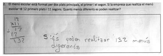 Esta estrategia fue usada en todas las categorías a partir del 3er curso. Los estudiantes utilizan el algoritmo de las operaciones de multiplicar o dividir. Por ejemplo, el alumno de la Figura 5 multiplica los 12 primeros platos del menú escolar con los 11 segundos para responder al total de menús diferentes que pueden realizarse.
