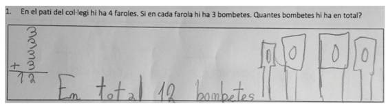 Uso de la multiplicación como suma de sumandos iguales. Esta estrategia se da en los problemas de isomorfismo de medidas de multiplicación y división medida, en los problemas de comparación multiplicativa de multiplicación y en los de división, con incógnita el referente, y en los problemas de producto de medidas de multiplicación. En el ejemplo mostrado en la Figura 6, el estudiante suma las bombillas de cada farola tantas veces como farolas le indica el problema que hay, para dar la respuesta correcta.