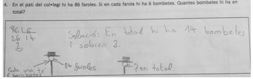Esta estrategia incorrecta se usó en los problemas de isomorfismo de medidas de multiplicación y de división partitiva, en los de comparación multiplicativa de división en los que la incógnita es el referente o el escalar, y en los de producto de medidas de división. La estrategia utilizada se basa en usar la operación inversa a la correcta para ofrecer una solución. Por ejemplo, el estudiante de la Figura 7 resuelve el problema haciendo la operación de dividir, cuando la operación correcta es la multiplicación.