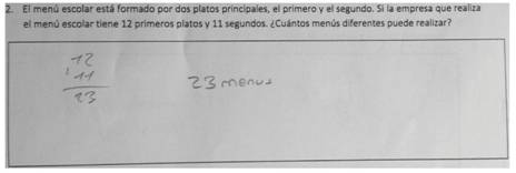Se hacen sumas o restas con los datos que proporciona el enunciado. Estrategia usada en todas las categorías de problemas, aunque con mayor incidencia en los de comparación multiplicativa, donde la incógnita es el escalar, y en los de producto de medidas de multiplicación y de división. Por ejemplo, el estudiante de la Figura 8 suma los 12 primeros platos y los 11 segundos para obtener la solución del problema (las distintas combinaciones).